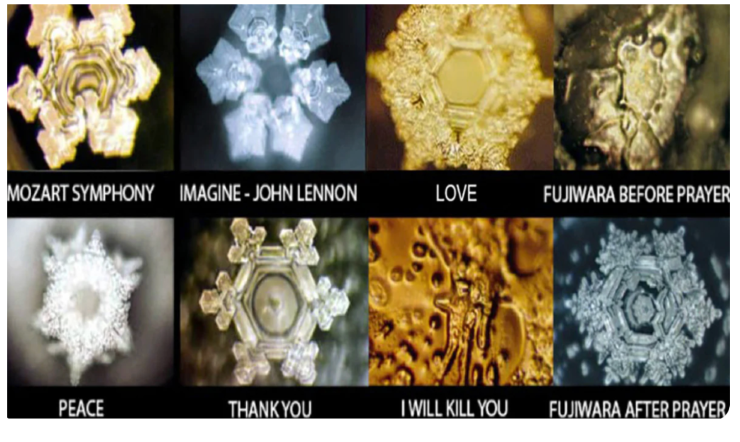 In his experiments, water exposed to positive words like "love" and "gratitude" formed beautiful, symmetrical crystals, while water exposed to negative words created chaotic, fragmented patterns.